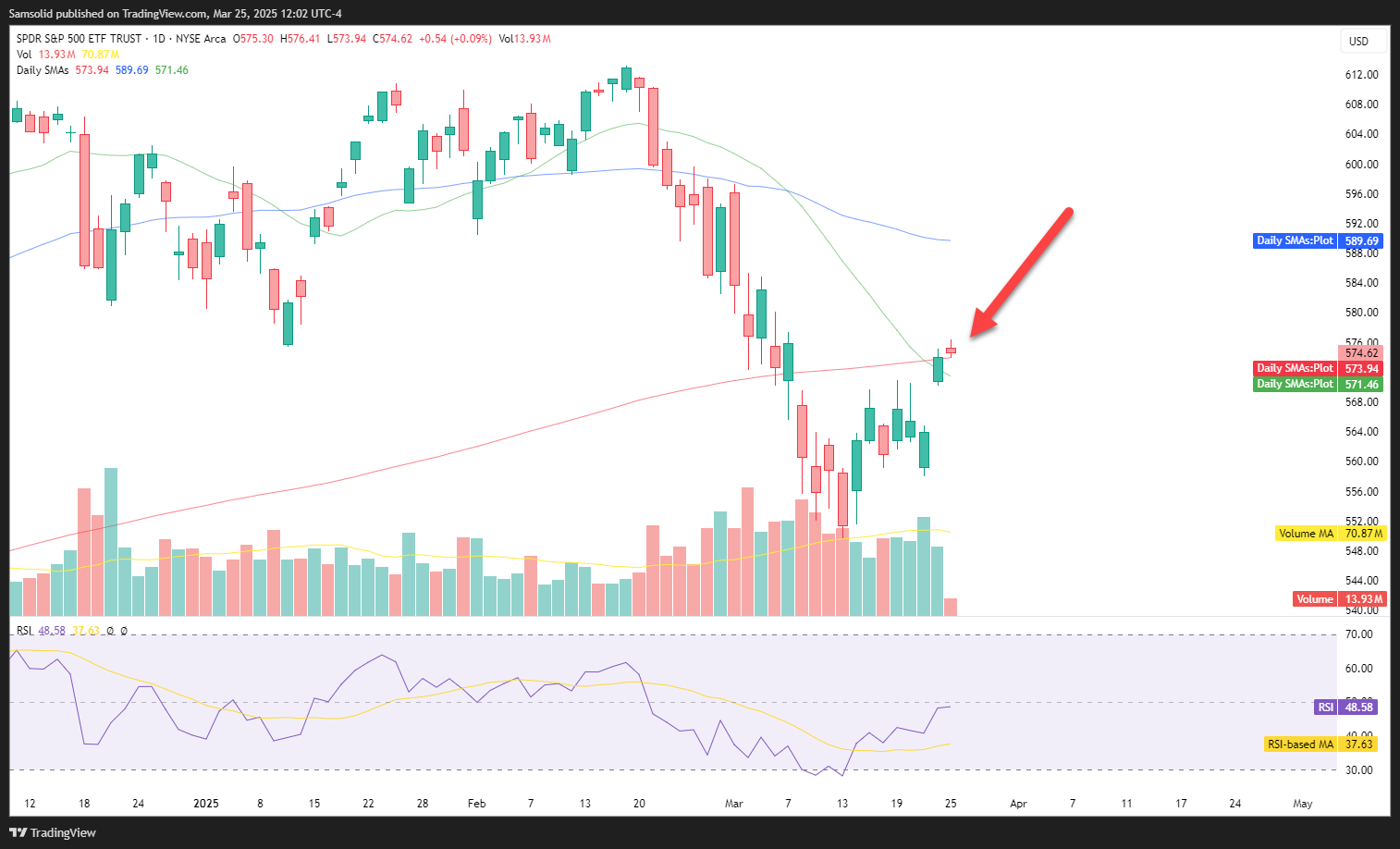We broke the 200-day moving average yesterday and finally closed above it. Today, we’re kind of hovering right over it. But what does that mean? Are we headed lower to revisit recent lows? Or are we charging toward new highs?