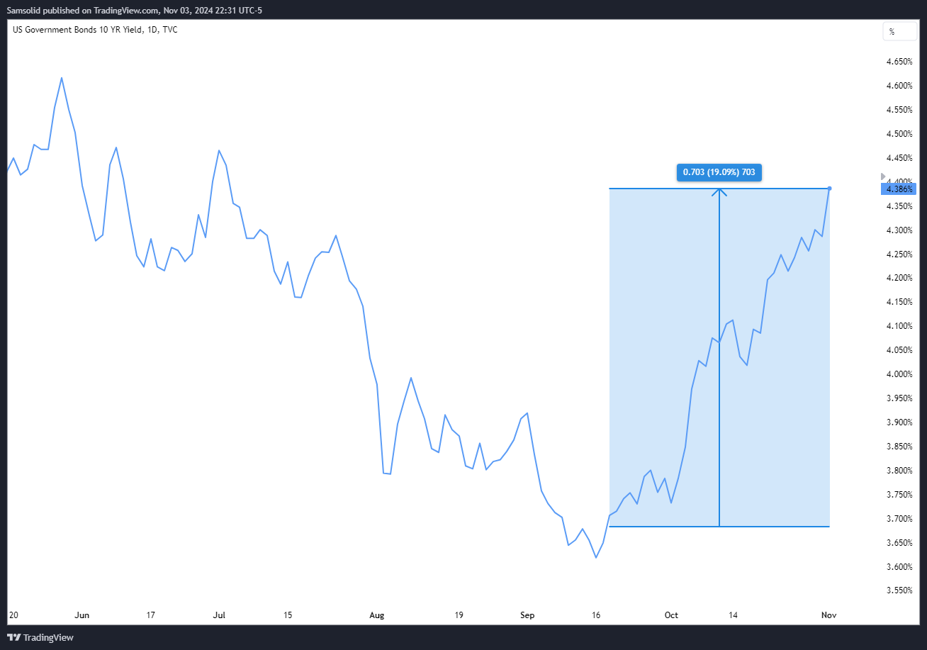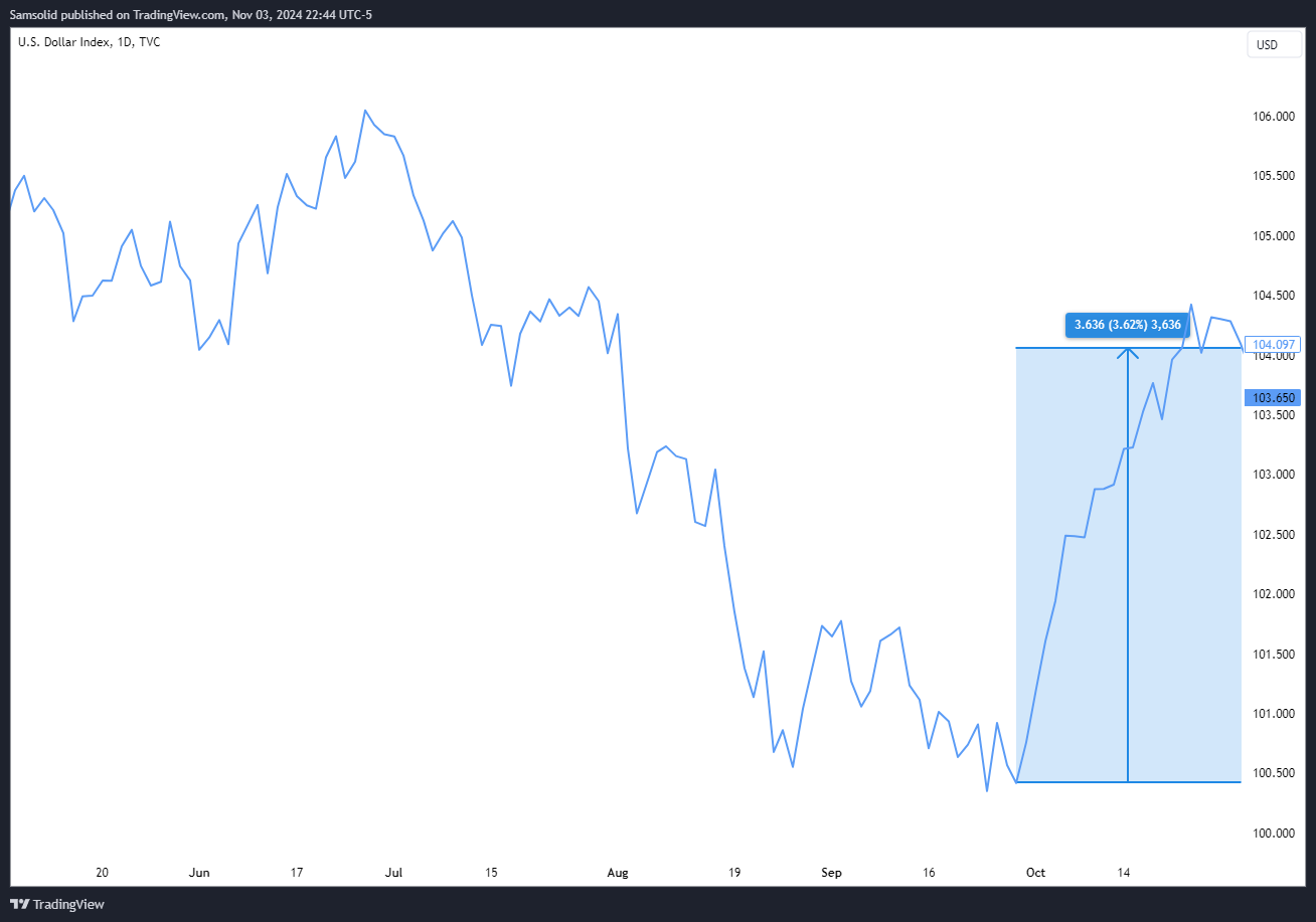 Despite the negative correlation between the US Dollar and stocks, the market rallied. This trend persisted until the last two weeks, coinciding with Kamala Harris gaining ground against Donald Trump in the betting markets.