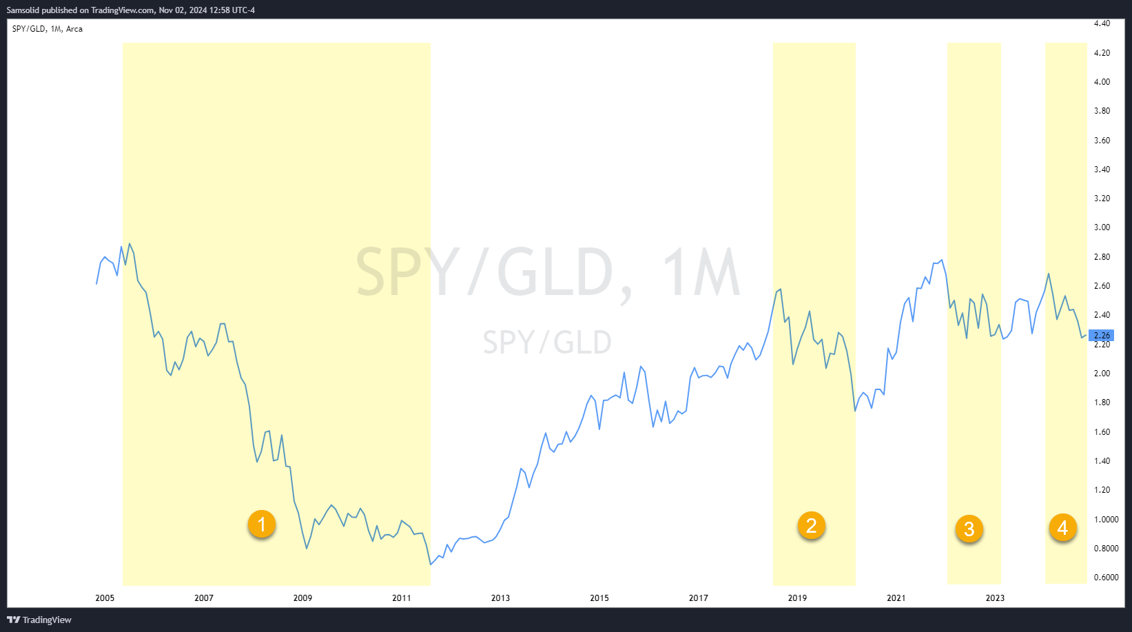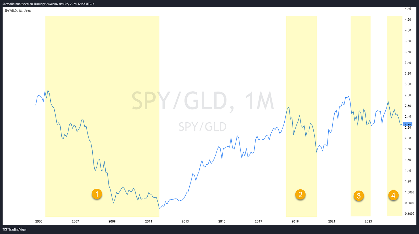 On a much larger time frame, there have been periods where Gold has outperformed the S&P500.