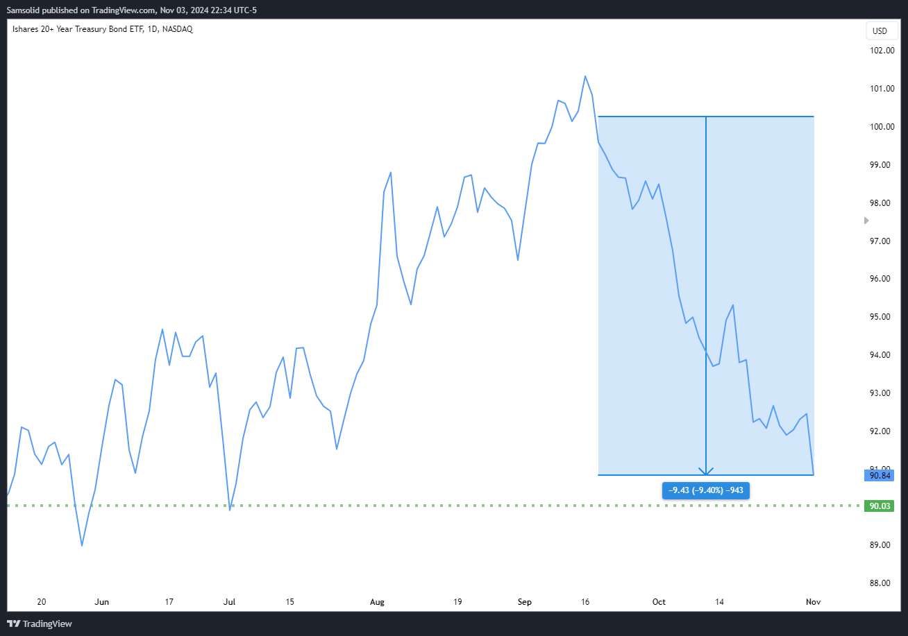 The 10-Year Yield has surged over 70 basis points since the September 18 FOMC meeting, even as the Fed lowered rates by 50 basis points. As evident from the chart, bonds were heavily bought leading up to the meeting, catching bond bulls off guard. Keep in mind that bonds and yields are inversely correlated: when bonds rise, yields fall, and vice versa.