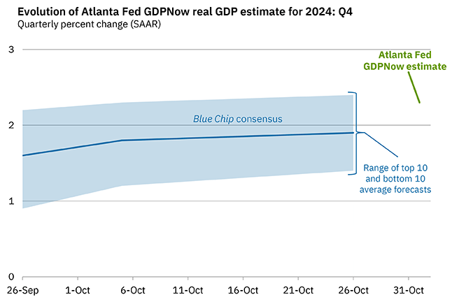 The economy shows resilience while inflation remains “sticky.” Unexpectedly, the unemployment rate held steady at 4.1% in October. Despite this, ADP Non-Farm Payrolls surged into double digits. Alarm bells about a spiraling job market are premature. Recent Hurricane impacts on the East Coast and ongoing strikes skewed the data. Focus on the trend: the economy is resilient. The Atlanta Fed GDP Nowcast remains above 2%.