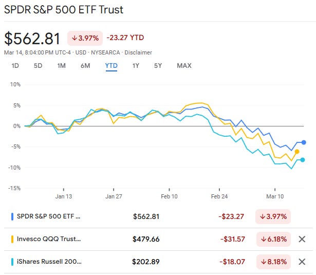 This is a big bounce off correction territory. Yesterday was the first time since the bear market ended in 2022 that we saw a daily close in correction territory for the S&P 500. From ATHs, we hit 10% down, QQQ was down 13.2%, and IWM was knocking on the door of a bear market at 18.5% down.