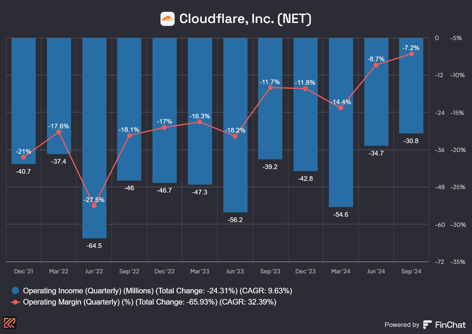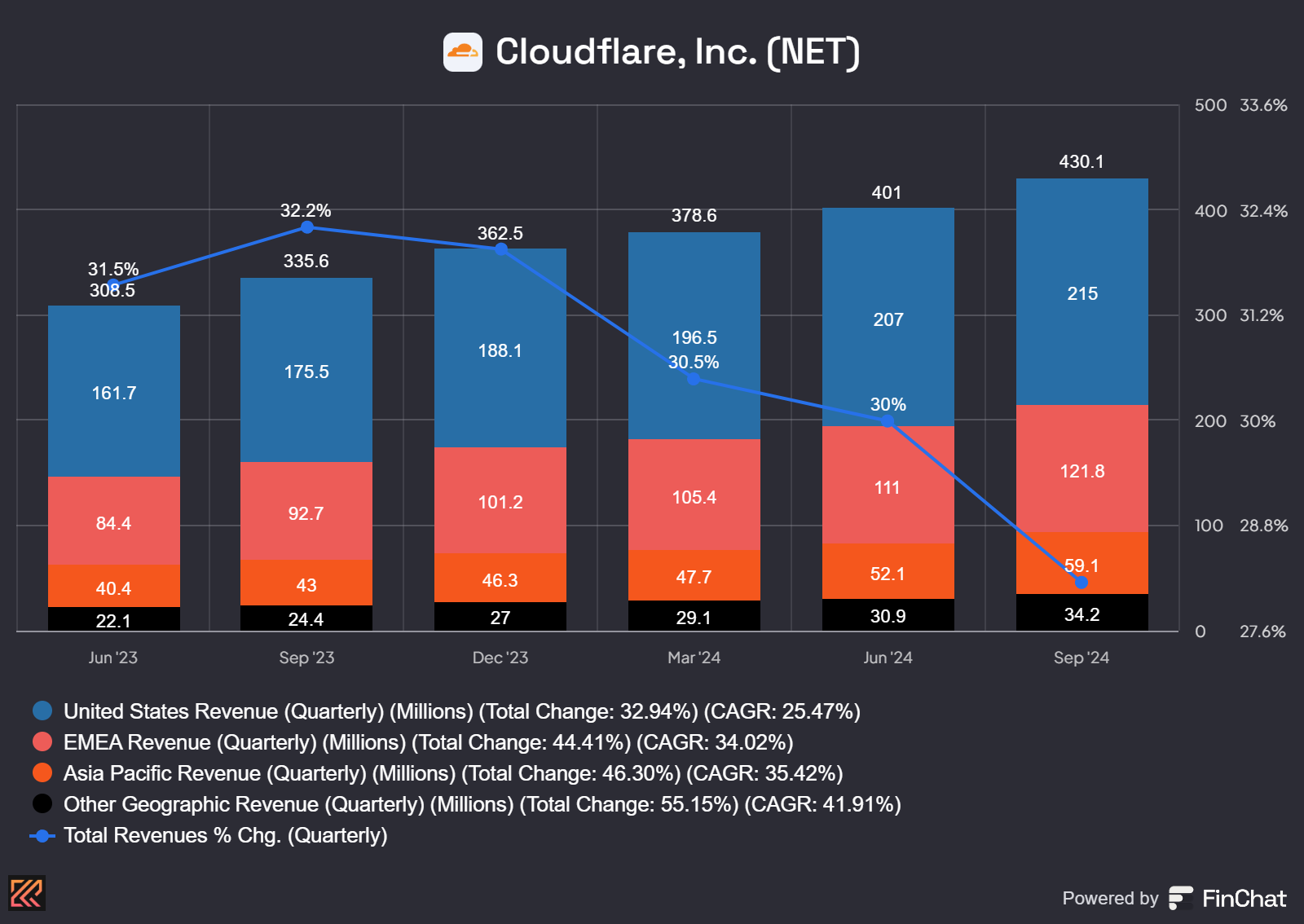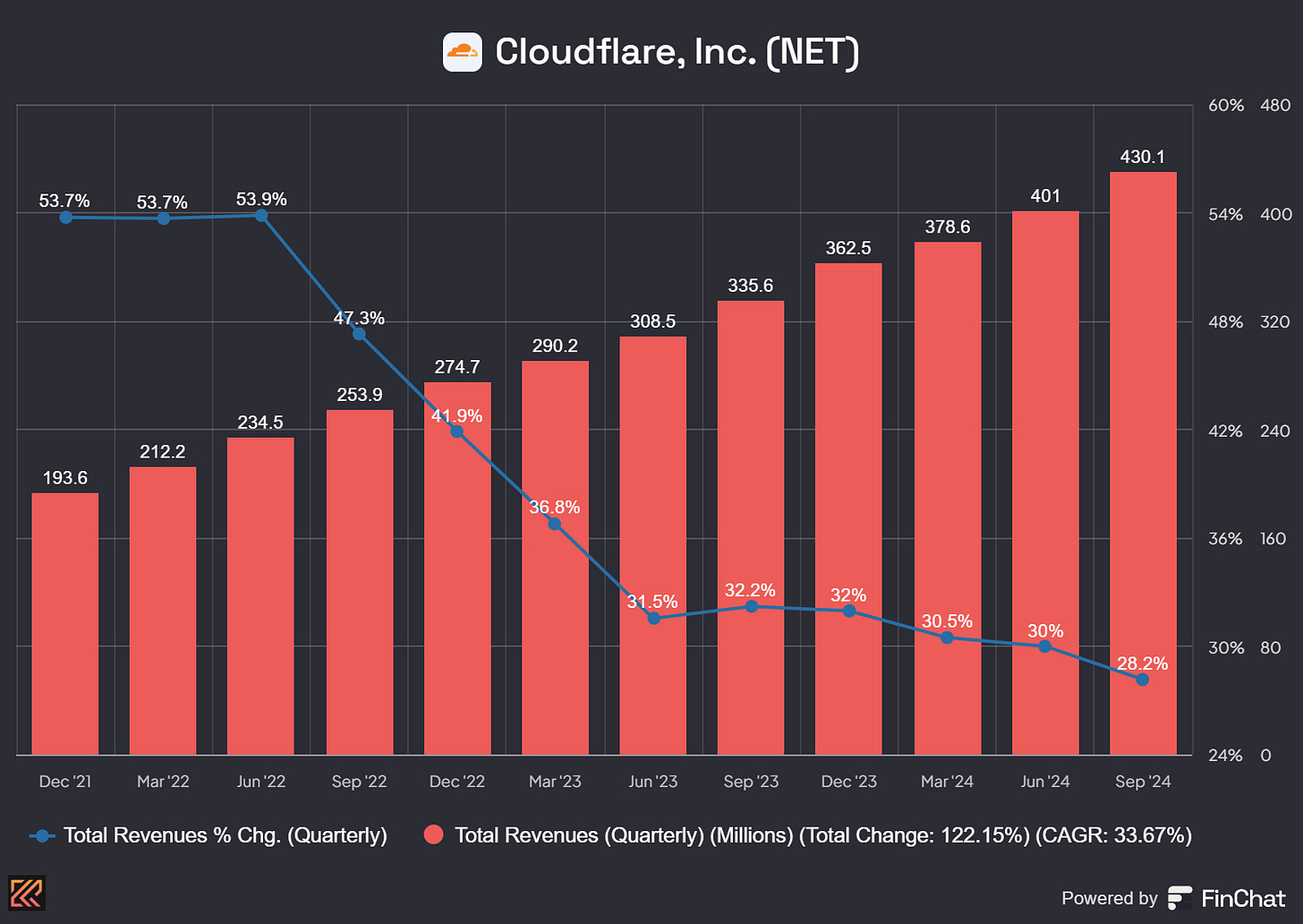 Strong Financial Performance: Cloudflare reported $430.1 million in revenue for Q3, a 28% year-over-year increase. Operating income reached $63.5 million, a 50% increase from the previous year, showcasing the company's effective cost management and ability to scale profitably.
