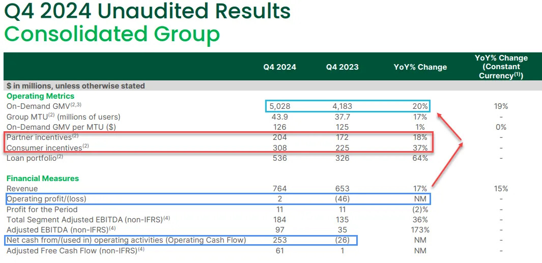 Grab’s FY24 Q4 results showed steady growth across all segments, but rising customer incentives and the gap between GMV and revenue raise concerns about profitability. While these issues are worth watching, the core thesis remains intact. Grab continues to grow, maintains strong cash reserves, and is progressing toward long-term profitability goals.