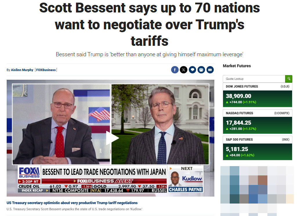 Scott Bessent said most countries are already in tariff negotiations with the U.S. The big outlier is China. Last week, Trump proposed a 20% increase on top of the existing 34% tariffs on Chinese imports. China responded with talk of a 50% tariff on U.S. goods.