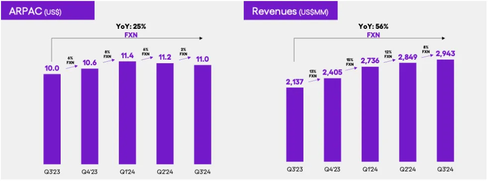As of September 2024, NuBank captured 54% of the adult Brazilian population as clients. Brazil's population continues to increase, leading to a rising Total Addressable Market (TAM). Monthly active users are at 84%. The average revenue per acquired customer (ARPAC) is $11, with a year-over-year increase of 25%. However, ARPAC has decreased sequentially over the last two quarters due to rapid expansion in Mexico and Colombia. Since ARPAC is a monthly average, newly acquired customers initially bring the average down until their revenue ramps up. Despite this, the cost to serve each customer is only $0.80 and has also decreased sequentially.