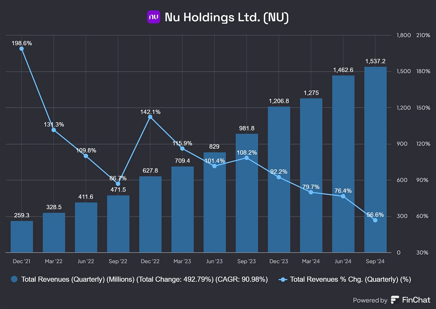 In the latest quarterly earnings, Nubank reported $2.94 billion in revenue, marking a 56% year-over-year increase compared to FY2023 Q3. However, revenue growth decelerated considerably due to the previously mentioned factors. For a company of this size, sustaining high double-digit growth over an extended period without sacrificing margins is challenging.