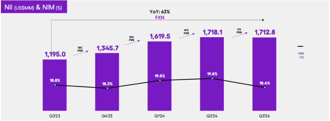 Net Interest Income (NII) represents the difference between the interest earned from NuBank’s lending portfolio and the interest paid on its deposits. This metric reflects how effectively a bank leverages its client deposits. NuBank reported an NII of $1.7 billion, which grew by 63% year over year. However, the Net Interest Margin (NIM) declined from 19.8% to 18.4%. This decline was partly due to customers improving their creditworthiness, making them eligible for loans with lower interest rates.