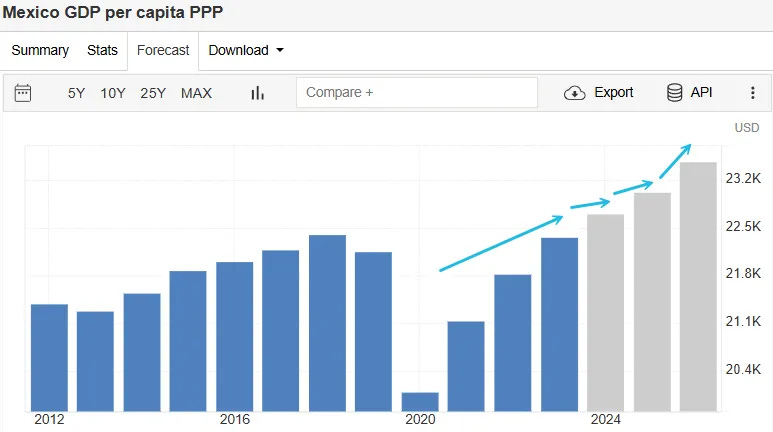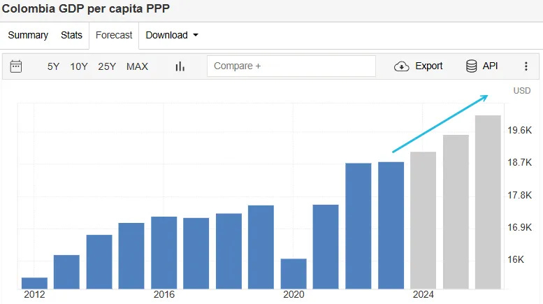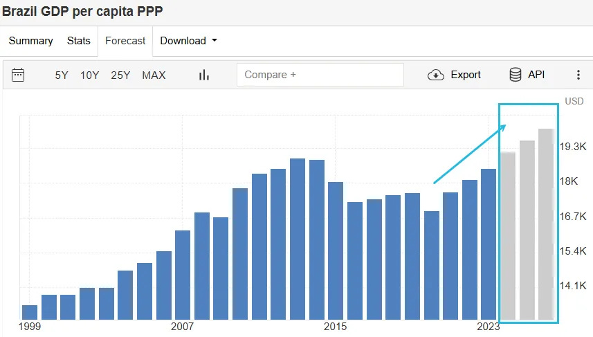Gross Domestic Product (GDP) serves as the productivity growth rate for most nations. However, we have observed that every country where NuBank operates is not only growing but also projected to either sustain or reaccelerate this growth. Concerning pricing power, it has shown a consistent rise over time, aligning with Pricing Power Parity.