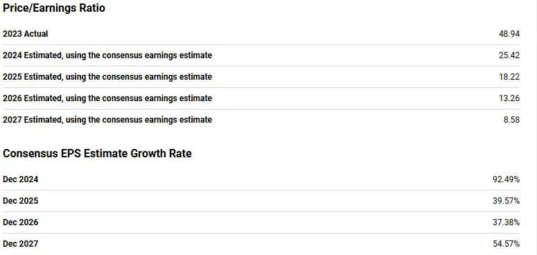 Nubank's FY2024 Q3 earnings revealed the stock trading at $10.33 per share, with a trailing P/E ratio of 25x. The forward P/E for 2025 is projected at 18x, and for 2026, it stands at 13x. Nubank is estimated to grow its earnings per share (EPS) by 40% in CY2025 and by 38% in CY2026. Interestingly, analysts forecast a 55% growth in EPS in CY2027.