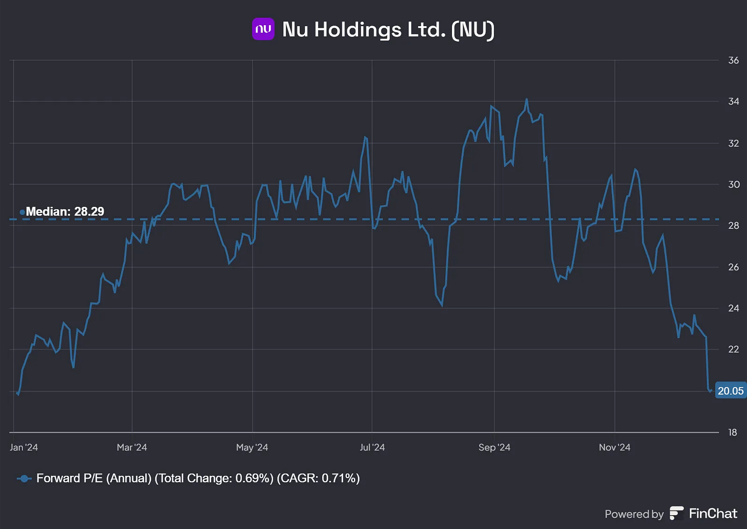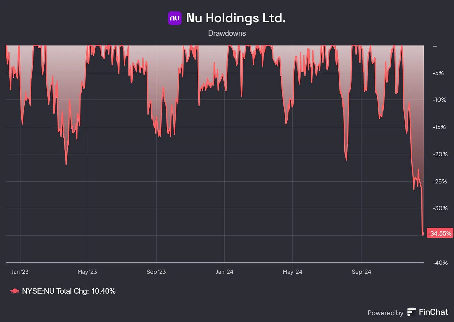 On November 11, 2024, NU reached an all-time closing high of $15.83, just two days before its FY2024 Q3 earnings release. Currently, NU is trading at $10.33, which is 34.74% below its all-time high, marking the largest drawdown in the last two years since the 2022 bear market.