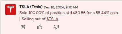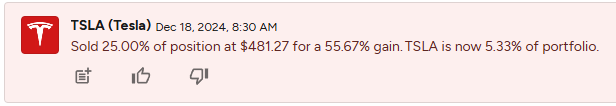 This morning, I took action based on these thoughts. I sold all my TSLA call debit spreads from the low 200s, reduced risk in many short-term options, and built a solid cash position. I wouldn't call it timing but rather a result of ongoing reflection on my portfolio. Over the past few weeks, I've been taking profits on some short-term swings and reallocating cash to high-dividend stocks and assets. Here are some of the moves I made in my SavvyTrader portfolio today (December 18, 2024).