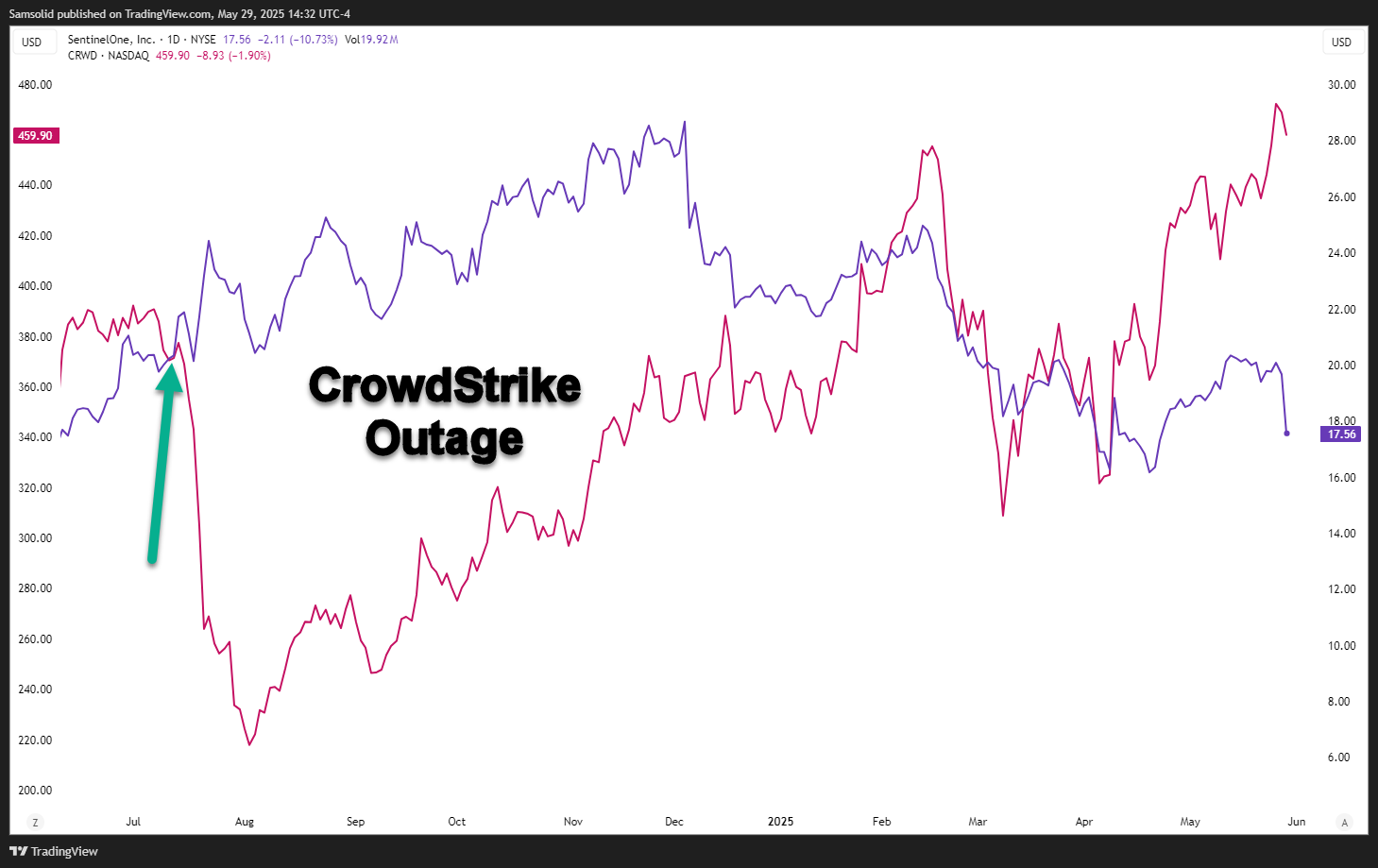 There’s something I need to discuss regarding SentinelOne. This used to be a holding in my portfolio, especially around the time of the major CrowdStrike outage, July 2024.