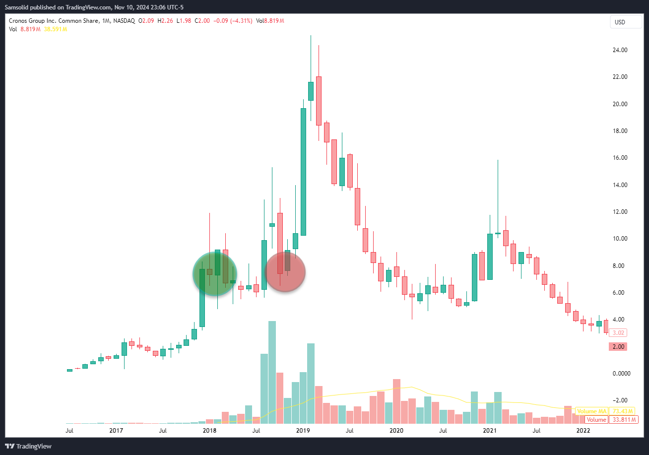 I used to be a long-term investor, though somewhat unintentionally. I experienced many wins in the market, but I also had my fair share of losses. One particular instance stands out. I bought $CRON when it was trading in the single digits. During the weed craze in 2017, many of these well-known tickers surged 5-10x in just a few months. I watched $CRON climb from $6 to the high teens and didn't sell a single share. The adrenaline was pumping, and I imagined my $3000 investment turning into $1M. Unfortunately, things didn't pan out that way, and I lacked the necessary insight at the time. I eventually sold it at a small loss. As you can see in the image below (green for buy and red for sell), the stock's trajectory changed shortly after I sold.