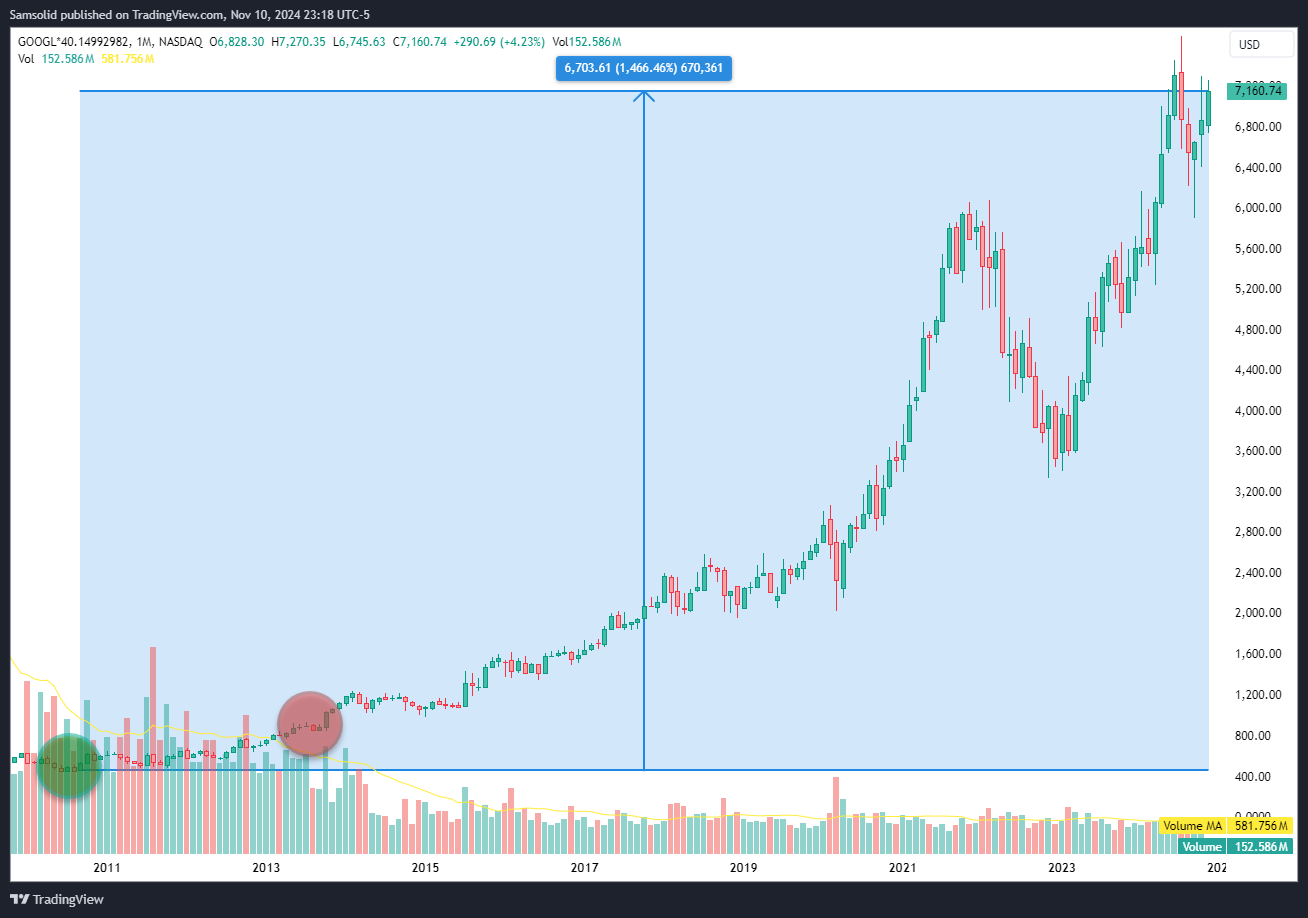 The first stock I bought was $AAPL in 2010. I went all-in at the time, but what did I know? I had heard about it and owned an iPhone, so why not, right? Several months later, after saving up more money, I bought stock in $GOOGL. That's when I started paying closer attention. Little did I know, there's such a thing as paying TOO much attention. Around 2013, my buddy started talking about penny stocks. Oh boy, you can guess where this is going. I sold my $GOOGL position after making about 300% and decided to dabble in the quick game of penny stock gambling. This was a surefire way to lose all my gains from $GOOGL and learn absolutely nothing in the process. If I had held onto $GOOGL until today, I would have seen a 14-bagger. Check out the chart below (adjusted for pre-splits).