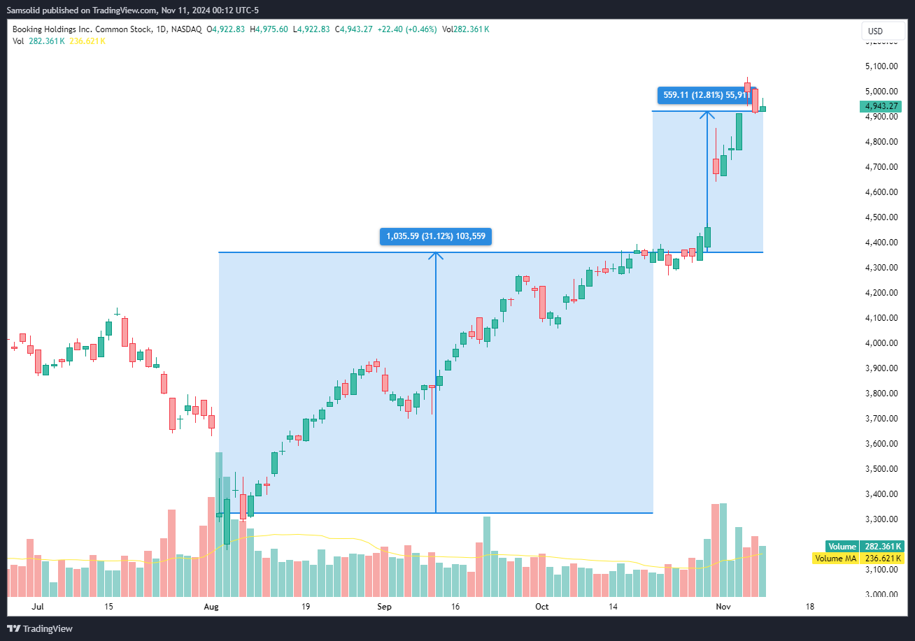 I had a core position in $BKNG with an average in the low 3000s. When the price hit new all-time highs in late October, I saw more lucrative opportunities that have since yielded greater returns compared to staying in $BKNG and locking the capital for an additional 12% gain.